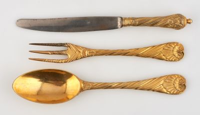A kés acélpengéjén késműves jegy, nyelének végén öntött, tagozott gomb. Díszítése: plasztikus kagylómotívum, csavart, vésett mintával. A háromágú villán és a lapos, ovális merítőjű kanálon hasonló díszítés.