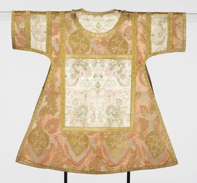 Anyag: | aranyszínű fémfonal; aranyszínű paszomány; selyem; selyem bélés |