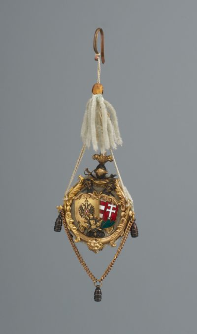 A historizmus szellemében készített emléktárgy, a heraldika elemeit felhasználva és hadi jelvények ábrázolásával. A bált rendező tüzérekre, fegyveres testület­ re utalnak a különféle fegyverek, de főként az ágyúk és lőszerek, miniatűr formában.