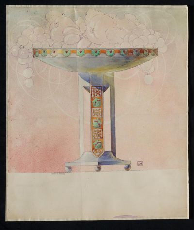 A rajzon látható csemegésállvány egyszerű, geometrikus hatású formája fém alapanyagra utal. A gömblábakon álló, lapított csonkakúp alakú talprészhez illeszkedő szár elemeit -