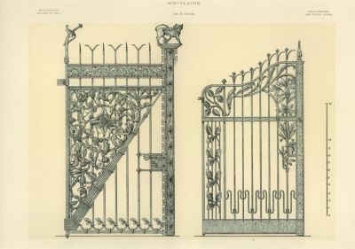 „A 221. rajzlap 1. ábrája azt a rácsos ajtót ábrázolja, mely a berlini „román házat” díszíti. Hammeran Valentin Frankfurt a/M-i vasműves munkája. A 2. ábrán előtüntetett rácsos ajtót Wittling és Guldner berlini műépítészek tervei szerint Methling és Gleichauf charlottenburgi műkovácsok készítették. Az 1. ábra román, a 2. ábra a modern [szecessziós] stílus formáit láttatja.”