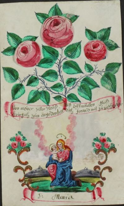 Középen lent virágdíszes rocaille-ok között dombok és felhők között ül Mária, ölében a gyermek Jézus. Középen feliratszalagon: "Von meiner zeller Reuss Bring ich zum angedenken ist Bild mitallen Fleiss dich Freund mit zu be..." Középen fent három szál rózsa lehajtható szirmokkal, azok alatt kegyképek másaival.