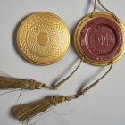 | Anyag: | bársony; fa; fém veretek; fémfonalas zsinór bojttal; kecskebőr; moiré selyem; papír |