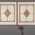 | Anyag: | barkanyomott bőr; fa tok; kecskebőr betét; pecsétviasz; pergamen; selyem zsinór |