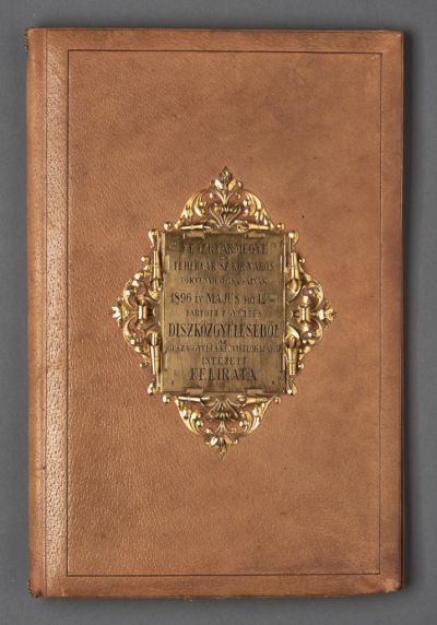 "Fejérvármegye és Fehérvár város törvényhatóságainak 1896. év május hó 12-én tartott együttes díszközgyűléséből az Országgyűlés Képviselőházához intézett felirata" - ez a vésett szöveg olvasható a világosbarna disznóbőr kötésű album előlapjának közepét elfoglaló aranyozott vereten. Az album hátlapjának sarkaiban egy-egy rozetta alakú csúsztatógomb. Az előzék kékesszürke ripsz. Maga a dokumentum a Magyarország ezeréves fennállását ünneplő közgyűlésen kelt.