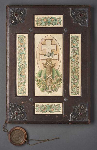 A Kaposvári Ügyvédi Kamara dísztagjává választja gróf Apponyi Albertet 1928. április 1-jén. Az album sötétbarna bőrkötésén középen egy nagyobb, körülötte négy kisebb téglány alakú mező, színesen festett pergamen betétekkel. A középső mezőben fasces, mögötte hármas halom kettős kereszttel. A kötés előlapján négy sarokveret stilizált növényi díszítményekkel és egy-egy vörös üvegkővel, valamint négy apró, rozetta alakú veret, hátoldalán pedig négy félgömbölyű csúsztatógomb. Előzéke moiré selyem.