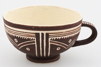 Technika: | barna mázas; bekarcolt díszítés; fehér földfesték, agyagmáz (engobe); írókával, szabadkézzel festett; korongozott |