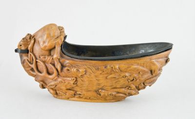 A díszcsésze csónak formájú, felmagasodó fogója szarvastompor. Oldalain szarvast, vaddisznót, nyulat és egyéb vadat űző kutyafalka.
