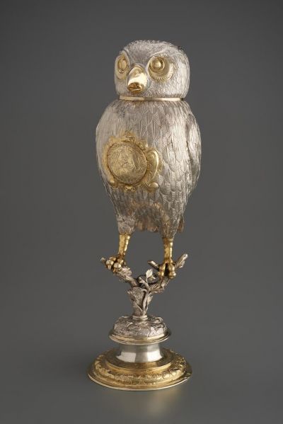 Leveles fatörzset utánzó talpra illeszkedik a bagolyfigura. Leemelhető feje a palack kupakja, testének üreges belseje kivehető pohárkát rejt. A madár testén középen aranyozott mezőben látható az egykori tulajdonos, "CHRISOPH (Sic!) HAFFNER" vésett címere és neve. A kupak leemelésekor az edény peremén az elővigyázatosságra, mértékletességre intő, a XVI. századi német verses közmondásokat idéző felirat válik olvashatóvá: "ICH ARME MAIS MACHT MIR DER KAUTZ SO ANGSTIG HAIS." (Engem, szegény kis egeret, félelemmel tölt el a bagoly látványa.) A szöveg moralizáló tartalmát a bagoly figurája is hangsúlyozza, hiszen ez a madár a 16. században a mértéktelenség szimbóluma volt.