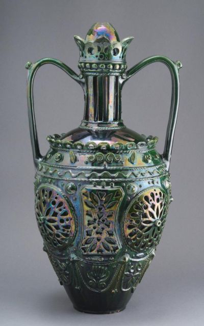 Díszedény - délvidéki népi kerámia (ún. koronás vagy királykorsó), áttört és rátétes elemekkel