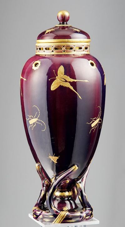 A hosszúkás, tojásdad alakú vázatest alacsony, hengeres talpon, kis nóduszon áll. A talapzatot körbefogó, domborművesen mintázott, arannyal kirajzolt faágakból négy plasztikus csonk ágazik felfelé, megtámasztva a vázatestet. A szájnyílást kefretelő peremet aranyozott szalagfonat díszíti. Az egész felületet kékeslila tónusú, "szilvaszínű", finom árnyalatkülönbségeket mutató máz borítja. A ragyogó mázon különböző rovarok aranyszínű alakjai helyezkednek el egymás alatti sávokban: a fedélen katicabogár és szárnyas bogár, a váza testén pillangó, hőscincér és apróbb szárnyas rovarok, a talpnál katicabogarak.