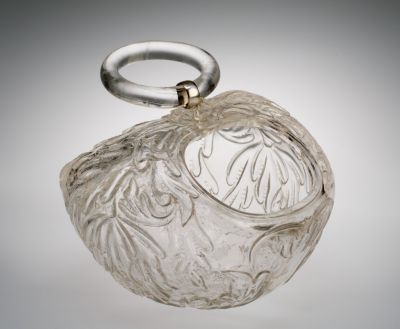 Íves, kosár formájú, teljes felületén metszett díszedény. Aljának közepét vésett rózsa, a test többi részét indamotívum díszíti. A "kosárka" két nyílásának találkozásánál, felül, ezüstből készült tagozatban vastag, simára csiszolt hegyikristály karika teszi lehetővé felfüggesztését.