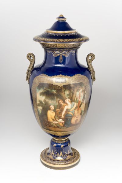 A kerek, sima, harang formájú talapzat kis, bemélyedő gyűrűvel kapcsolódik a tojásdad vázatesthez, melynek felső részéhez orsó formájú nyak és bronzgyűrűvel hozzáerősítve, gazdagon kiképzett szájrész csatlakozik. A kisebb átmérőjű fedél kupolás, lapos fogógombos. A talpon tűzaranyozott pánt, a váza vállán kétoldalt utólag felerősített, tűzaranyozott, bronz fülek, melyek levélformában, csigamotívummal felmagasodnak. A váza főnézetében széles, gazdagon és finoman díszített keretben egy porcelánkép. Az aranyozott keret főmotívumai: vadszőlő, repkény, olajág, minden oldal közepén egy-egy kisebb mező. A festmény témája: a zene megszemélyesített ábrázolása. Festői, tájképi környezetben három muzsikáló nőalak, antikizáló leplekbe öltözötten. (Eustache Le Sueur: Melpomene, Erato és Polyhymnia című, 1652-ben készült festménye nyomán, Musée du Louvre, Párizs - lásd itt)