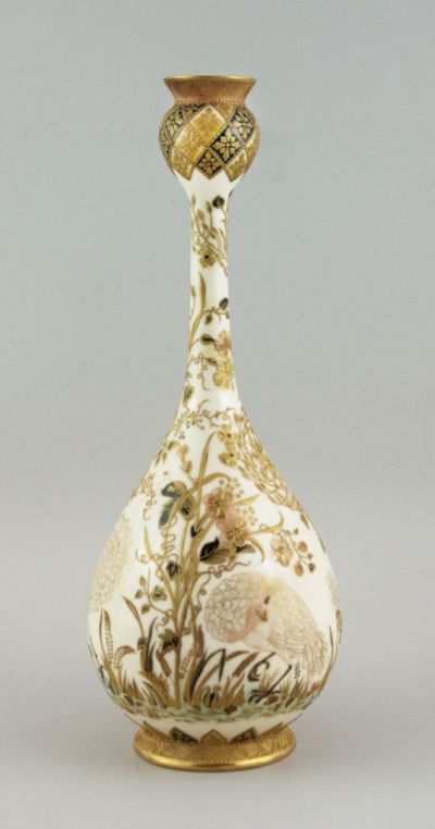 Kerek, alacsony talpon körteformájú test, hosszú keskeny nyak. A száj csészeszerű. A forma és a díszítés perzsa előképeket követ. A világos alaptesten máz felett finom, domború aranyozás rajzolja ki a körbefutó dekorációt. A nyakra aszimmetrikusan fűszálak és virágzó vékony ágak nyúlnak fel. A szabadon hagyott két mezőben fácántyúkok csibékkel, vékony aranyvonalakkal. A máz alatt pink, halvány- és sötétzöld, sárga színek árnyalják a síkszerű, dekoratív rajzolatot.