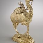 Trébelt, növényekkel és csúszómászó állatokkal borított, ovális domború talpon elülső jobb lábát felemelő teve alakja, poncolt és vésett szőrzettel borítva. Nyaka a fejével, valamint szőrrel borított púpja a rajta lovagló, baljában láncos kantárt tartó kisgyermekkel együtt leemelhető. (A kis tevehajcsár felemelt jobbjában egykor tartott bot elveszett.)
