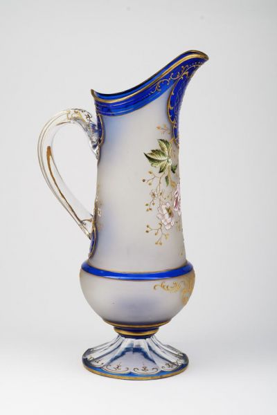 Széles, felfelé keskenyedő lapokra csiszolt talpon, alul gömbszerűen kiszélesülő, majd szűkülő henger alakú, széles szájban, csőrös kiöntőben végződő test. A talp szélén hullámosan kialakított kobaltkék réteg, felette aranyozott rocaille, illetve lambrequin díszítés. A testen aranyozott, neoro- kokó kartusokból, illetve rocaille-motívumokból álló díszítmény, fölötte barnával, rózsaszínnel és zölddel festett vadrózsás ág. A szájperem aranyozott, alatta a kobaltkék üvegrétegből kialakított, magas aranyozású rács- és rocaille díszítésű kartus.