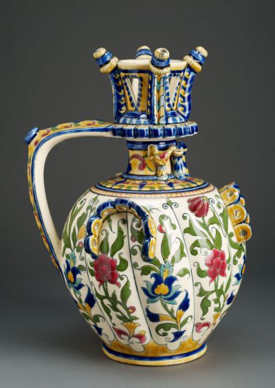 Technika: | gerezdelt; kézzel formált; magastüzű színes mázakkal festett; plasztikus díszítés |