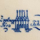 | Jelzés: | alján masszába nyomott 1161 (formaszám), 16 (méretszám) PÉCS ZSOLNAY. Máz alatt kobaltkékkel bélyegzett márkajelzés: Zsolnay Pécs (dőlttel) öt templomtorony ábrája, T. J. M. (dőlttel); kézzel írott 25 (festő száma) |