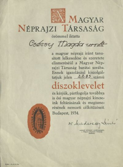 Díszoklevél - a Magyar Néprajzi Társaságtól Csécsy Magda részére