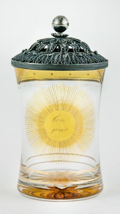 Azonos talp- és szájátmérőjű, testének középrészénél összeszűkülő pohárforma. Alján ovális alakú csiszolatok, falán ezüstpáccal és aranyozással kialakított motívumok: napkorong, középrészen bon jour felirattal. Alja fölött két aranyozott csík, szájpereme alatt ezüst-sárga mezőben aranyozott csillagok. A mezőt széles aranyozott csík, lent hullámvonal kereteli.
