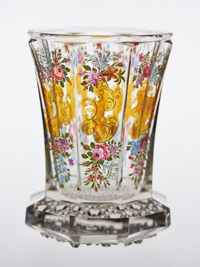 Technika: | ezüsttel pácolt (silberezett); fúvott; lapokra fazettált; színes zománcfestés |