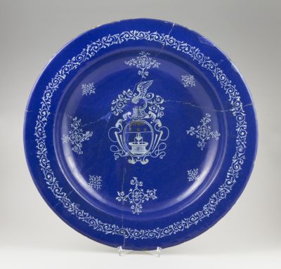 Keskeny peremű, széles, mély öblű tál. Peremén finom rajzú indadísz, öblének szélén négy kisebb rozetta, közte négy stilizált virágos-indás dísz. Közepén kartusban a velencei Fontanák beszélő címere: ovális pajzs kék mezejében fehér kút, kék pajzsfőben hét arany lángnyelv, alatta három hatágú csillag, rostélyos sisak, dísze sasszárny. Voit Pál 1560 körül Velencében készült műként publikálta a Fontana címer alapján. Patakyné Brestyánszky Ilona a 16. század második felében készült faenzai munkának tartja.