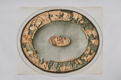 A dísztál középső, ovális alakú reliefje – melynek azonos méretű analóg példánya megtalálható a bécsi Kunsthistorisches Museum gyűjteményében (ltsz: 4173) – a klasszikus mitológia hősnőinek egyikét, Galatheát ábrázolja, tritonok és nereiszek által vontatott kagylófogatán.