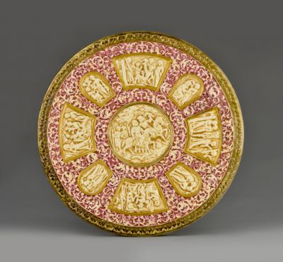 Technika: | aranyozott; csontszínű mázzal fedett; domborműves díszítés; fémlüszter festéssel; formára korongolt |