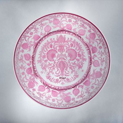 Széles (10,5 cm) peremű, öblös tálforma, öblében rozalin réteges üvegből cameo maratott, stilizált szegfű- és tulipán-motívumok, apróbb, leveles növényi ornamentikával, a peremen körbefutó, leveles gránátalmák, illetve virágos szegélydísz, melyet széles csík zár le. A magyaros, maratott díszítményű Sovánka-munkák mesterdarabja.