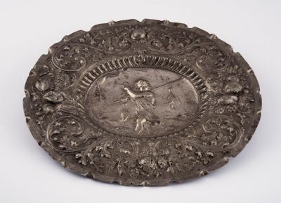 Dísztál - szárnyas vadászzsákmányt tartó puttóval