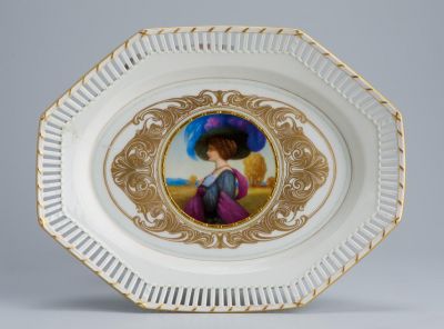 Nyújtott nyolcszögű forma, pereme áttört, peremszegélye szalaggal átfont. Öblében hatalmas tollas kalapot viselő hölgy profilban ábrázolt képe, a háttérben sík táj. A kör alakú kép kerete domború aranyfestéssel és világoszöld gyöngysor zománcfestéssel készült, ezt ellipszisben arannyal festett stilizált tolldíszítmény fogja közre.