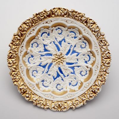 Technika: | aranyozott; máz felett színesen festett; negatív forma felhasználásával készült |