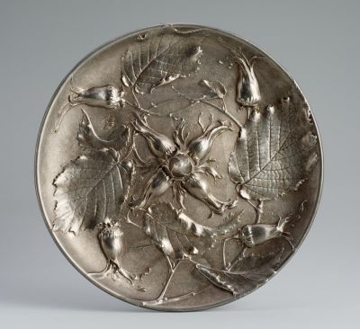Feltehetően ez a tányér is Brateau 1897-ben készült, naturalisztikus növényi díszű edénysorozatának egy darabja. Jules-Paul Brateau az 1897. évi párizsi Salonon mutatta be először különféle növényekkel: gránátalmavirággal (Thiébault-Sisson 1897, 162.), olajbogyóval (Thiébauls-Sisson 1897 165.), búzakalásszal (Molinier 1897, 100.), lóherével (Molinier 1897, 103.), fagyönggyel (l. IM Ltsz. 52 a-b) stb. díszített, gyakran felirattal is ellátott, formájukban, méretükben némileg különböző ónserlegeit és egyéb asztali edényeit.