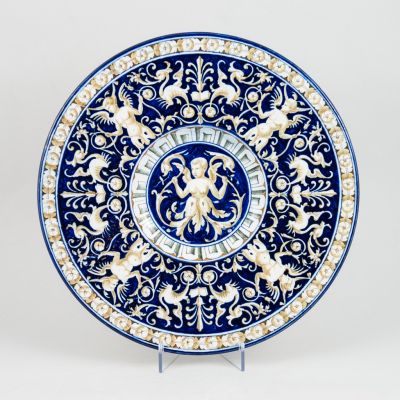 A tondino, azaz a széles, egyenes peremmel keretelt, kis mélyedésű reneszánsz tányérformát kék alapon fehér, okkersárga, kevés zöld és terrakotta színekkel gazdagon festették, a késő reneszánsz kori minták felhasználásával. A geometrikus frízzel keretelt közép-mezőben szárnyas női félalak, alsó testéből kétfelé ágazó, delfinben végződő levélindákkal. A szintén geometrikus frízzel szegélyezett tányérperemen négyszeresen ismétlődő dús, groteszk díszítmény, szárnyas női alakok, palmettás, könyves, sárkányos elemek között.