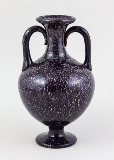 A márványszerűen pontozott, erezett üveg kialakítása hűen követi az amphoriszkosz formát. (Az aphoriszkosz olaj-, illetve kenőcstartó, az amforához hasonló, de kisebb méretű edény, melyet az i.e. 1350 körül Egyiptomban vagy Cipruson, majd hosszú szünet után a keleti mediterrán területeken, i.e. 600-100 között állítottak elő.)