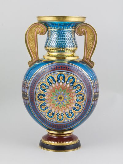 A díszváza - erősen módosított formával és arányokkal - emlékeztet a 14-15. századi hispano-moreszk Alhambra vázatípusra, díszítése a Lobmeyr cég ún. Arabeskendekorja.