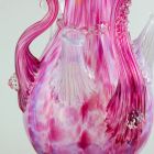 Széles, aljára visszahajló peremű, középrészénél kúposán emelkedő talpon, orsós tagon körte alakú test, hosszú nyakkal, tölcséresen kibővülő, visszahajló peremű szájjal. A test középrészét és a szájat három, aljukon szedret formázó üvegcseppekkel, felső részükön üvegszárnyakkal díszített, bordázott fül köti össze. A fülek közötti mezőkben három, bordázott cső, a nyakon hullámos gyűrű. A test - az optikai díszítés következtében - bordázott, s rózsaszín, beolvasztott üvegfonallal sávozott és pettyezett.