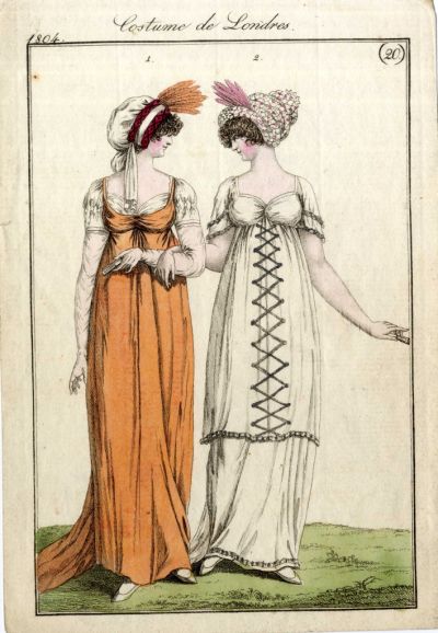 Divatkép - két nő, az egyik barackszínű, a másik fehér ruhában, melléklet, Journal des Ladies et des Modes, Costume Parisien