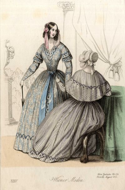 Divatkép - két nő, az egyik lila fehér csíkos, a másik kék virág- és levélmintás ruhában,,melléklet, Wiener Zeitschrift für Kunst, Literatur, Theater und Mode