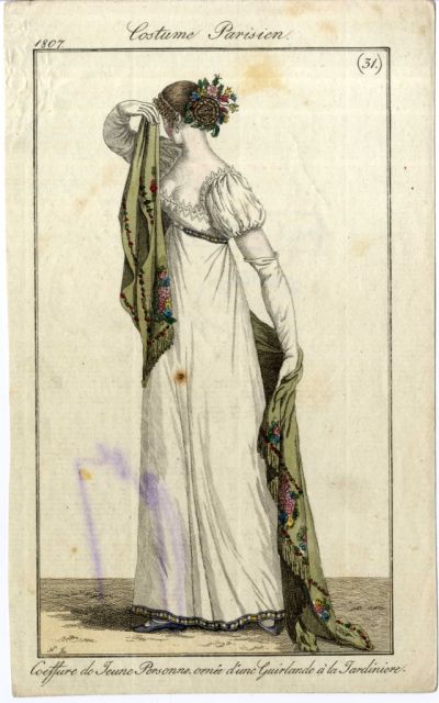 Divatkép - nő fehér ruhában, kezében nagy zöld kendővel, melléklet, Costume Parisien