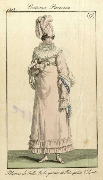 Divatkép - nő rózsaszín ruhában, tollas fejdísszel,melléklet, Journal des Ladies et des Modes, Costume Parisien