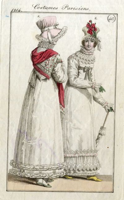 Divatkép - női viseletek, díszes kalapokkal, melléklet, Journal des Ladies et des Modes, Costume Parisien