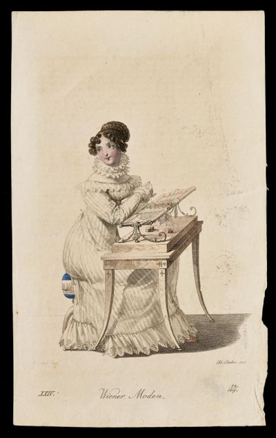 Divatkép - varróasztalka előtt ülő és hímző fehér ruhás nő, melléklet, Wiener Zeitschrift für Kunst, Literatur, Theater und Mode