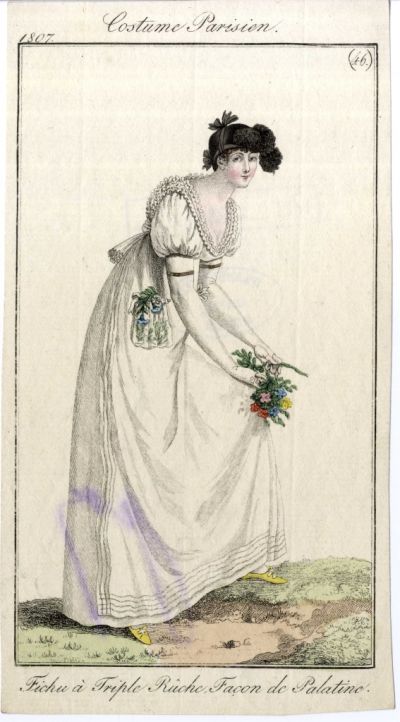 Divatkép - virágot szedő nő fehér ruhában, melléklet, Costume Parisien
