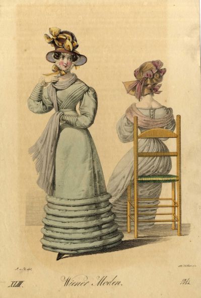 Divatkép - zöldesszürke női ruha elöl- és hátulnézetből, melléklet, Wiener Zeitschrift für Kunst, Literatur, Theater und Mode