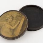 Lapos, kerek, esztergályozott fadoboz, leemelhető fedéllel. Homorú oldalfalai és belseje feketére festettek. Fedele és a fenék külső oldala egy-egy rézmetszettel díszített, ezek ábrázolásai: a Napóleon ellen harcoló uralkodók és hadvezérek portréi, illetve Klió – a történetírás múzsája – kőtáblára vési a lipcsei „Népek csatájának" dátumát 18. October 1813.