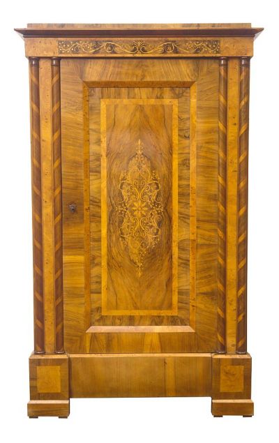 Egyszerű felépítésű, hasáb alakú bútortest, magas talapzatában egy fiók. A bútortestet kétoldalt csavarszalaggal berakott két-két féloszlop határolja. Az ajtó téglalap alakú mélyített betétjén berakott szalagdísz. A betét mező középpontjában és a zárópárkányon finomrajzú ornamentális intarzia. Fent kevéssé tagozott, alig kiugró párkánylezárás.
