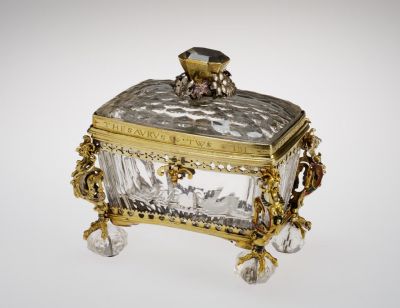 Az igen szépen metszett és finom munkával megformált ékszertartó ládika foglalatának felső részén Máté evangéliumából vett idézet olvasható: VBI EST THESAVRVS TVVS IBI EST COR TVVM (Ahol a te kincstárad, ott van a te szíved is. - Mt. 6.21)
