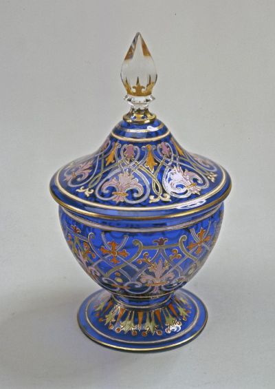 A Zayugróci Üveggyár 1896-os ajándékozási jegyzéke (IM Adattár, KLT 144) az edényt ékszertartóként határozza meg: "Ékszertartó: sötétkék, égetve ornament aranyfonatok, a fedő hegye kristály, csiszolva".