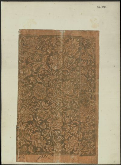 Narancssárga alapon aranyozott hátterű nagyobb indákkal, levelekkel, szőlőfürtökkel.